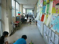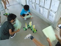 3年生の教室の方から、楽しそうな声が聞こえてきたので行ってみると、理科「風のはたらき」の勉強をしていました。風の強さによって、物の動き方はどのように変わるのかを調べるために、一生懸命、自分の車に風を送っていました。最後は、教室の半分を使って競争もしていました。みんないい笑顔でした。