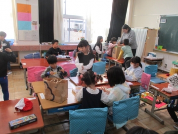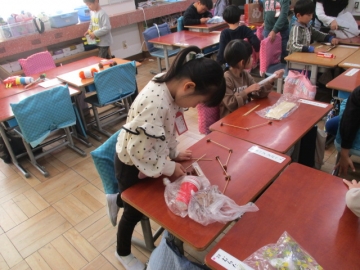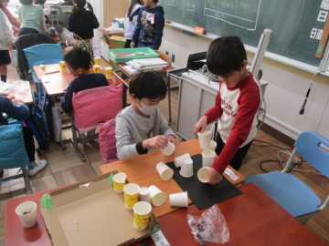 1年生がせいかつで「秋のわくわくランド」をつくろうと取り組んでいました。わくわくランドとは、松ぼっくりやドングリ、落ち葉等、秋ならではの材料と紙コップや段ボール等を組み合わせて、いろいろな遊び道具をを作り遊ぶことのようです。グループごとに分かれて思い思いの道具を作っていました。