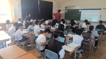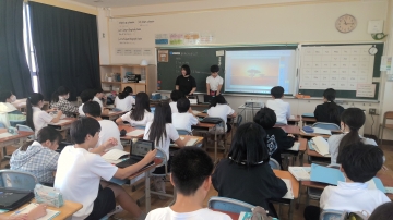 6年生の外国語は「動物クイズ」でした。自分で好きな動物を一つ選び、ヒントを出してみんなにクイズとして出していました。「〇〇に住んでいる。〇〇が好物である。」等、少しずつ答えに近づくようにヒントの順番も考えていました。