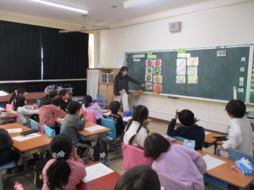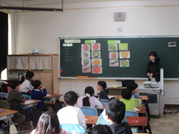 2年生が食育で「やさいはかせになろう」というテーマで学習していました。クイズからスタートして、色の濃いやさい、色の薄い野菜、それぞれの体への働きを学んでいました。自分の健康づくりのための時間となりました。