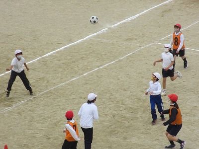 攻め上がり、ゴール前に投げてセンターリングをするという攻めができるというルールのサッカーをしていました。