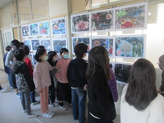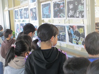 3年生は、紙版画を作り、裏から色をつけてきれいな版画に仕上げました。学年全体の作品を見るために