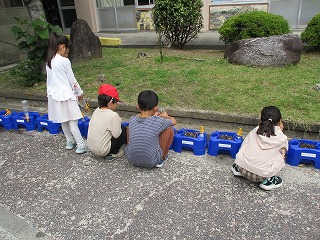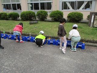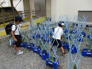 朝、1・2年生が水やりをする姿が見られます。1年生はアサガオに一生懸命の水をあげています。双葉が出はじめみんな嬉しそうに見ています。2年生は