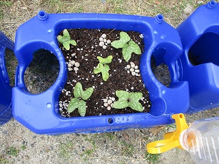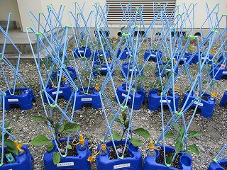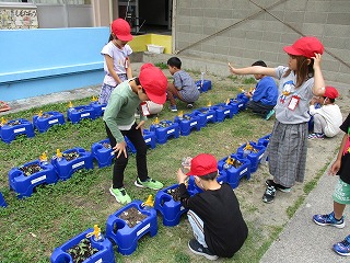 自分が選んだ野菜に水をあげています。2週間前に植えた苗がぐんぐん育っています。収穫が楽しみですね。