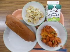 黒糖パン 牛乳 鶏肉とじゃがいものケチャップがらめ れんこんサラダ