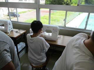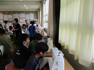 6年生が家庭科でミシンを使ってトートバッグを作っています。ミシンの操作に苦戦しながらも楽しんで取り組んでいます。