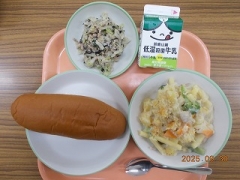 黒糖パン 牛乳 チキングラタン ひじきサラダ