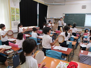 1年生が音楽で「ぶんぶんぶん」を楽しそうに歌ったりリズムをとったりしていました。リズムを手拍子やタンバリンでとり、歌を歌いながらとても楽しそうに活動していました。