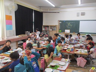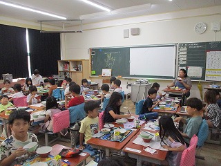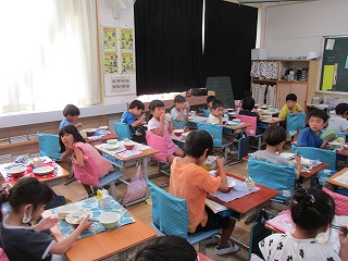 今日のメニューは、さんまのかば焼き、白菜炊き、米飯、牛乳です。4限目に1年生の教室を見に行った際、何人もの子どもたちが「お腹が空いた」と言っていたので、1年生の給食の様子を見に行きました。みんなおいしそうに食べていました。