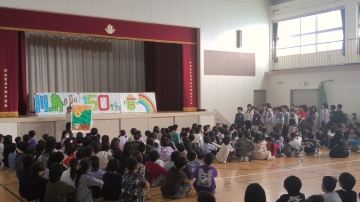 今日11月28日は川島小学校の創立記念日です。その日に合わせて集会を開催しました。この集会の目的は「川島小学校の歴史を振り返るとともに、創立150年をお祝いする。自分たちの学習の発表の場とし、互いの学年の学習内容を知る。」でした。