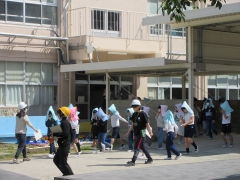 子どもたちは皆、減災頭巾をかぶり、静かに真剣な面持ちで訓練に参加していました。