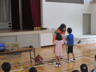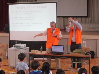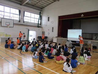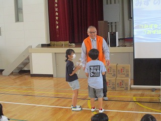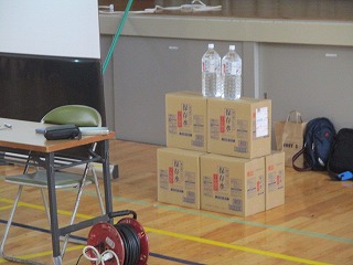 川島地区防災協議会より1年生が保存水を一人一本いただきました。2限目はその贈呈を兼ねて水の大切さの話を聞きました。いただいた水は、いざという時のために南校舎3Fの倉庫に保管します。過去何年間分の水も倉庫に保管されていて災害に備えています。