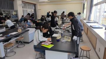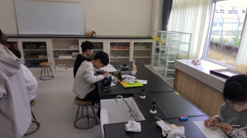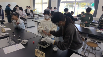 6年生が理科で試験官に入っている水溶液は何かをいろいろな方法で調べました。熱したり、リトマス紙をつけたり、匂いを嗅いだりしながらその結果から水溶液の正体を予想しました。「白っぽいのが出てきたで食塩水か重曹やよな」「くさいにおいやでアンモニアじゃない」など学習した水溶液の性質を振り返りながら取り組んでいました。