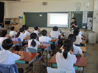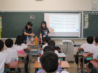 養護教諭、栄養教諭の2人がおかしやジュースに含まれる砂糖の量を紹介すると、子どもたちからは「そんなに」という声が上がっていました。これまでにも学習したことはあるようですが、改めてこの砂糖の量を見て驚いていました。合わせて歯みがきの大切さも確かめ合っていました。