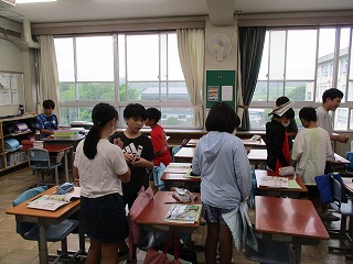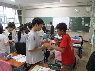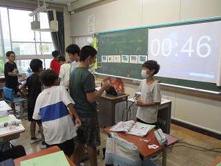 ではゾンビゲームを楽しんでいました。一人ひとりがカードを持ちながら教室内を動きます。出会った友だちと自分の好きな「日本の行事」を伝え合い、その後ジャンケンをし、