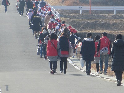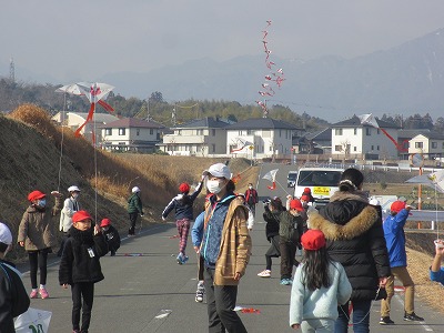 教室で行った凧作り。できあがった凧を持って、土地改良区の道路に移動しました。天気はとてもよかったのですが