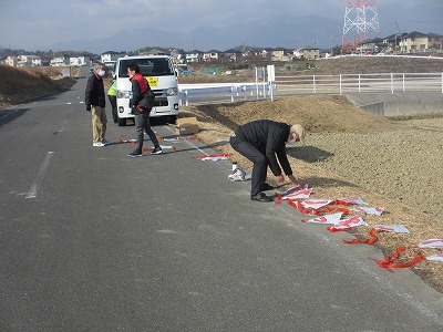 みんなで土地改良区の道路まで移動 連凧を揚げられるように準備していただき