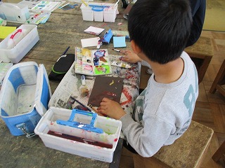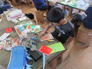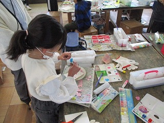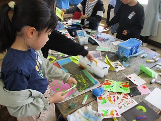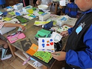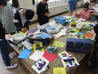 4年生が図工の時間に「いろいろなもようの色紙」作りに取り組んでいました。指でなぞる、ビー玉やペットボトルの蓋に色をつけて転がす、歯ブラシを使って色をつける等、それぞれが工夫をしてもようを作っていました。友だちの作業を見合って楽しんで作業を行っていました。