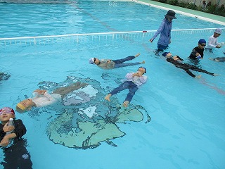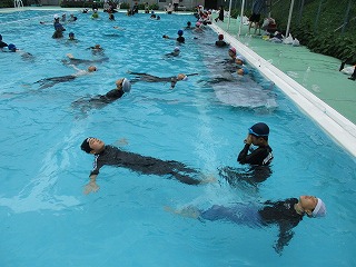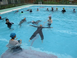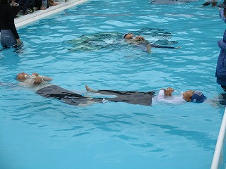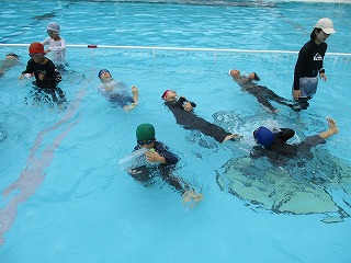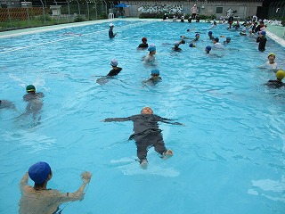 2年生はペットボトルを使って浮く練習をしました。ペットボトルでも結構な浮力があることを身をもって体験できたようです。また、6年生は何も道具がない場合の