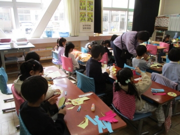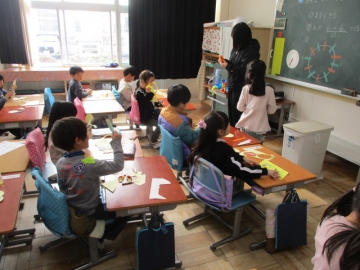 来週の28日、6年生が送る会が行われます。その送る会に向けて、各学年で6年生に感謝の気持ちを伝えるために準備をしています。1年生は登校班、給食、掃除等お世話になった気持ちをメッセージとして書いたペンダントを作っています。気持ちを込めて文字を書き、のり付け等もていねいに作業していました。1年生の気持ちはきっと6年生に届くことでしょう。