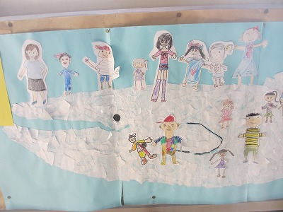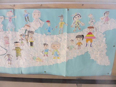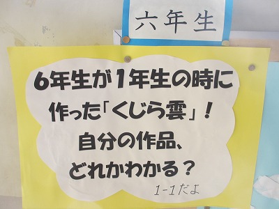 そこには、クジラ雲にのっている子どもたちの絵がありました。元1年1組のみなさんは、自分の描いた自分を見つけられるでしょうか?