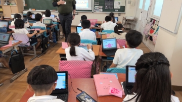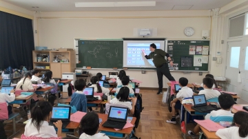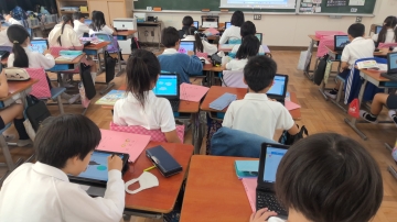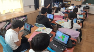 3年生が外国語活動でグリーティングカード作りに取り組んでいました。〇、△、▢に好みの色をつけて、模様を作っていました。次時に自分の作った模様を説明しあうそうです。うまく説明できるかな?楽しみですね。