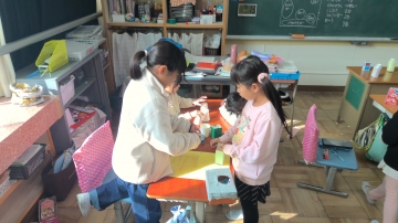 2年生は生活科で「おもちゃづくり」に取り組んでいます。昨年、自分たちが1年生の時にしてもらったように、自分たちで作ったおもちゃを使って1年生と一緒に遊ぶことが目的です。今日は作ったおもちゃで実際に遊んでみて、よりよくするにはどうしたらよいのかを考え合っていました。