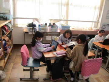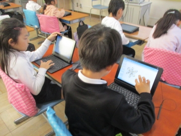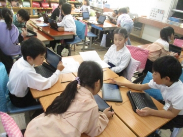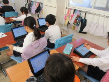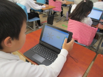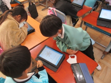 2年生のかけざんの学習の様子です。毎日九九の学習は続けていますが、この時間は図に表されている〇の数を数えるための式を作ろうというものでした。計算しやすいように、タブレットの図に自分の考えを書き込んでいました。