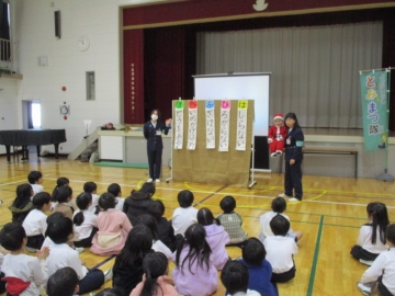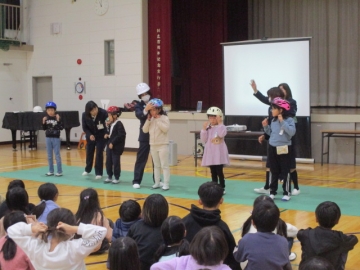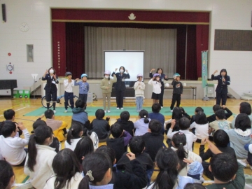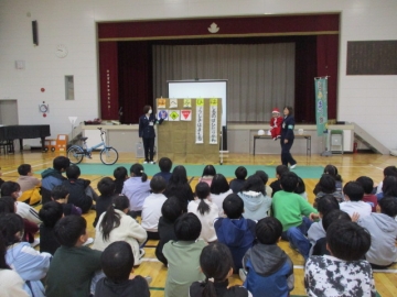 11月27日の高学年の交通安全教室に続き、今日は2限目3年生、3限目2年生、4限目1年生が体育館にて交通安全教室を行いました。交通指導員「とみまつ隊(止まる・見る・待つ」の方にお越しいただき、横断歩道の歩き方、ヘルメットの正しいかぶり方等を指導していただきました。各学年とも1時間ずつ、とてもていねいにお話しいただき、子どもたちも一生懸命に聞いていました。これまで以上に交通安全の意識が高まったことと思います。ありがとうございました。