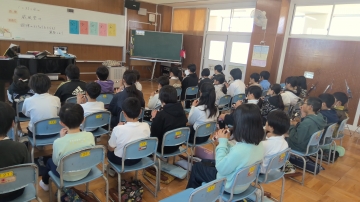3限目、5年生の音楽の授業の様子です。授業の最初、ウォーミングアップとして「こげよマイケル」を歌ったり、ピアノの伴奏に合わせてリコーダーをアドリブで重ねて楽しんだりしていました。子どもたちは授業へのスイッチが入り、その後の活動も意欲的に行っていました。
