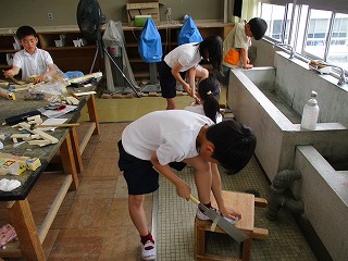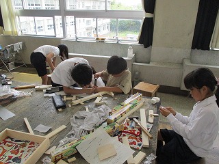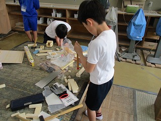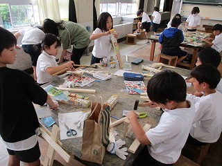4年生が図工で「いろいろな板を組み合わせて、楽しく使えるものを作ろう」という活動をしています。「写真立てを作る」「連絡ボードを作る」「動物の飾りを作る」等、それぞれが自分の作りたい物をを作っていました。子どもたちの様子を見ていると、のこぎりで苦戦していました。板をしっかりと踏んでのこぎりを引くのですが、踏む力が弱く板がずれてしまうことが多いようでした。しかし、これも経験です。上手くできるようになるために工夫を重ねて作業を進めていくことでしょう。