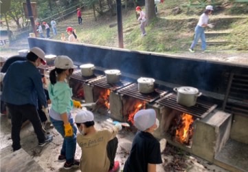 午前中は飯ごう炊さんでした。子どもたちは煙に苦戦しながらも、楽しそうに薪や葉っぱ燃やしていました。できたカレーはとても美味しかったようで、笑顔が見られました。