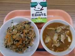 シャキシャキ鶏そぼろ丼 牛乳 豚汁
