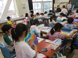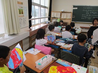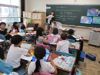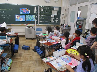 2年生が図工で「たまごの中から」といったテーマで、たまごと中から飛び出してくる物を考え、色を塗り、作品を作っていました。今日はそれぞれが考えた「たまご」を作っている場面でした。色鮮やかで模様もとても工夫した「たまご」を描いていました。「中から何が出てくるの」と尋ねると、「秘密」と教えてもらえませんでした。完成が楽しみです。