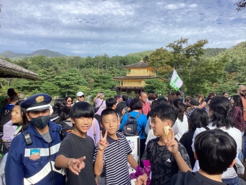 金閣寺に到着しました。とても混雑していますが、班ごとの写真を撮っています。