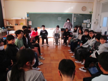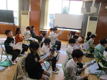 6年生は「スピーチ」を行っていました。2学期に思い出に残っていることを中心に、一人ずつが2分ほどのスピーチでした。事前に文の構成を考え、話したいことが何点あるのかや、「まず・・・」「次に・・・」「最後に・・・」等を使い、順序だてて聞き手にわかりやすいように話していました。