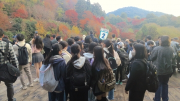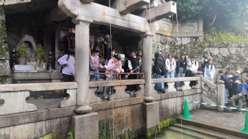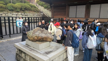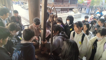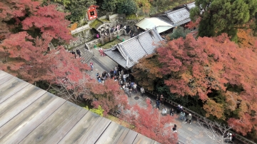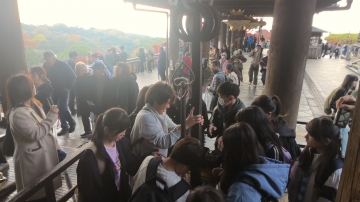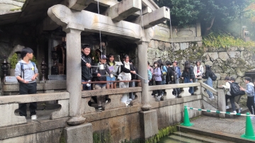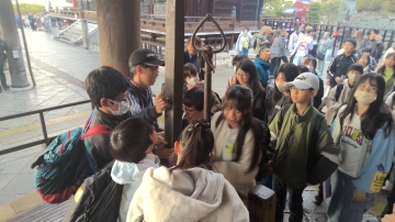 午後になり雨も上がり、清水寺の見学と買い物です。清水の舞台からは京都の街と紅葉を楽しむことができました。音羽の滝の近くで班ごとに分かれて班活動が始まりました。一目散に買い物に向かう班、音羽の滝の水を飲んでからという班と様々でした。