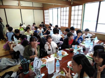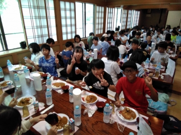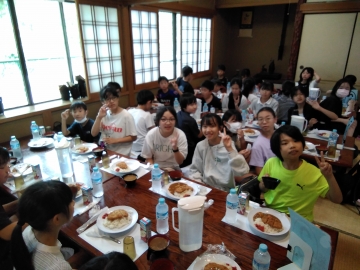 昼食会場に着きました。朝が早かったこともあり、昼食が待ちどおしかったようです。カツカレーを美味しくいただいています。