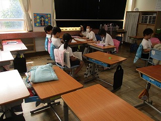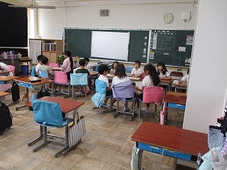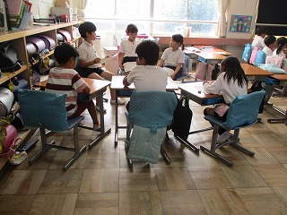 2年生が国語で作文を書いています。まず「伝えたいこと」を自分で考え、そのことをグループで相談していました。しっかりと友だちの考えを聞き、お互いに意見を交換していました。