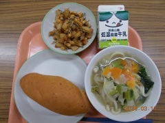 小型玄米パン 牛乳 五目うどん 小魚入りポテトビーンズ