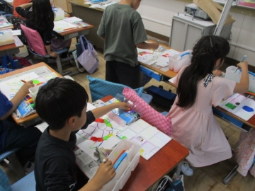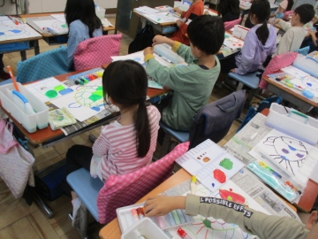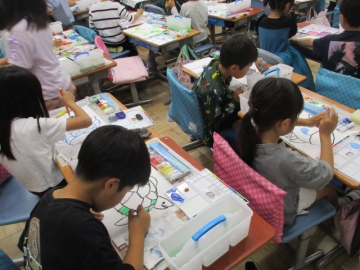 たくさんの色を使うこと、隣り合った場所は同じ色を塗らないこと等、いくつかの約束事を確認してから取りかかりました。どの子もみんな真剣、線から絵の具がはみ出さないように丁寧に作業をする2年生でした。
