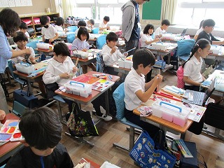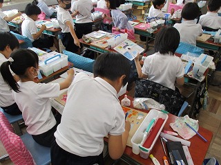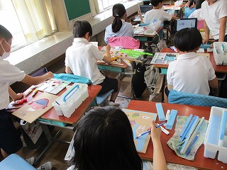 3年生の図工で「トントンコロコロゲーム」作りに取り組んでいます。板に思い思いの絵を描いた後、釘を打ち付けて完成させていきます。今日は板に絵を描く作業でした。いろいろな絵を参考にしながら作業を進めていました。