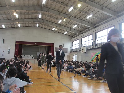 が転任されます。お一人ずつからあいさつをしていただきました。そして、子どもたちとのお別れをしました。その後、養護教諭の加藤亜里紗先生が