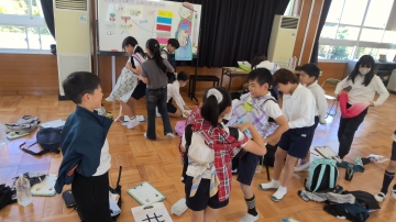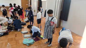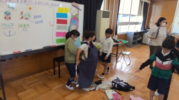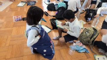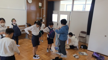 昨日5年生が養護教諭の指導で妊婦体験を行いました。妊婦さんが背負うであろう重さには足りませんが、水を入れた2Lのペットボトル2本をリュックに積めるなどして実際の重さを感じていました。座ったり立ったりしたときの大変さなど、いろいろな動作をして体感していました。