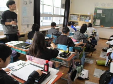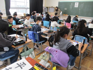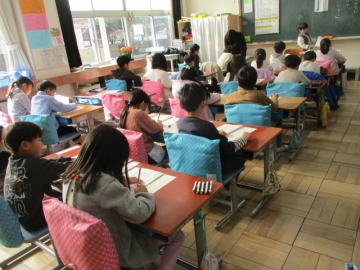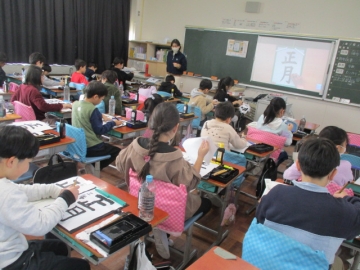 担任から用紙や半紙が配られ、書く前にめあての確認をしてから書き始めていました。