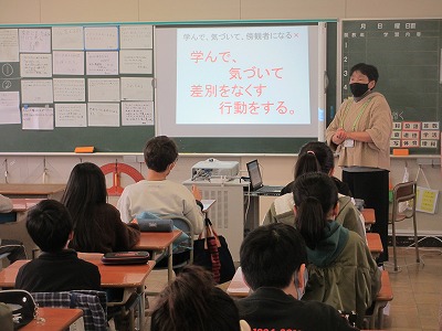 人権プラザ神前の伊藤玲江先生にお越しいただき、「差別とは何か」「差別をなくすための取り組み」等について話をしていただきました。