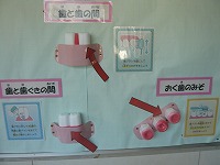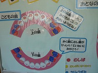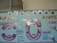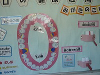 現在の掲示は「歯と口の健康週間」です。全校のみんなの歯科検査の結果をこどもの歯と大人の歯に分けて、シールを貼って視覚的に表してみました。すると、見事に奥歯が虫歯になっていることが分かりました。この”むしばマップ”を見てもらうことで、少しでも奥歯のハミガキが進んでほしいと願っています。