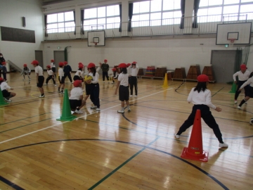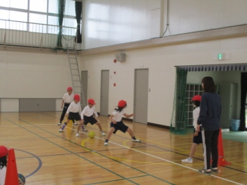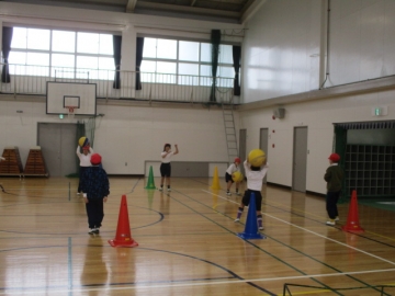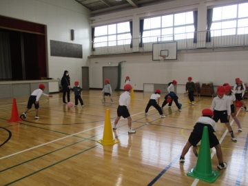 2年生が体育館でボールを使っていろいろな運動に取り組んでいました。転がしたり投げたりと、簡単なゲームをしながら楽しんでいました。また、ドッジボールやソフトバレーのボール等、運動によって使うボールを選んでもいました。