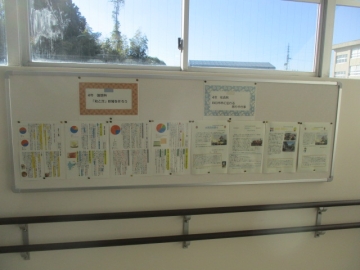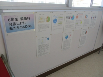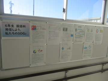 各学年の掲示板が校内に設置されています。6年生は国語「発信しよう、私たちのSDG's」について、5年生は「自然教室」について、4年生は国語と社会の学習のまとめが掲示してあります。見る人に伝わるように、わかりやすくまとめられています。