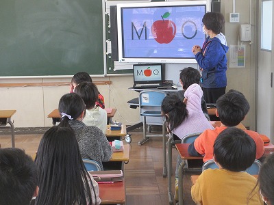 真ん中の文字がリンゴで隠されています。「隠されているのは、何という文字ですか?」という問いに多くの子どもたちが挙手していました。